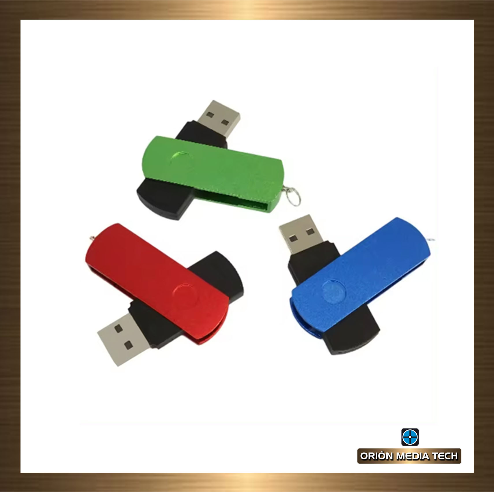USB Publicitario giratorio anodizado, resistente al polvo y golpes, chip grado A. Disponible en cualquier color. Incluye serigrafía UV. Capacidades desde 1GB hasta 128GB.